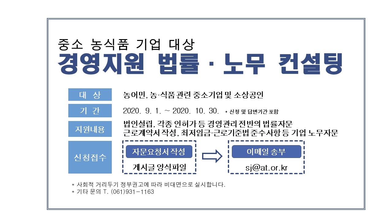 - 제목 농어민, 중소 농식품 기업 대상 법률·노무 컨설팅지원 - at센터