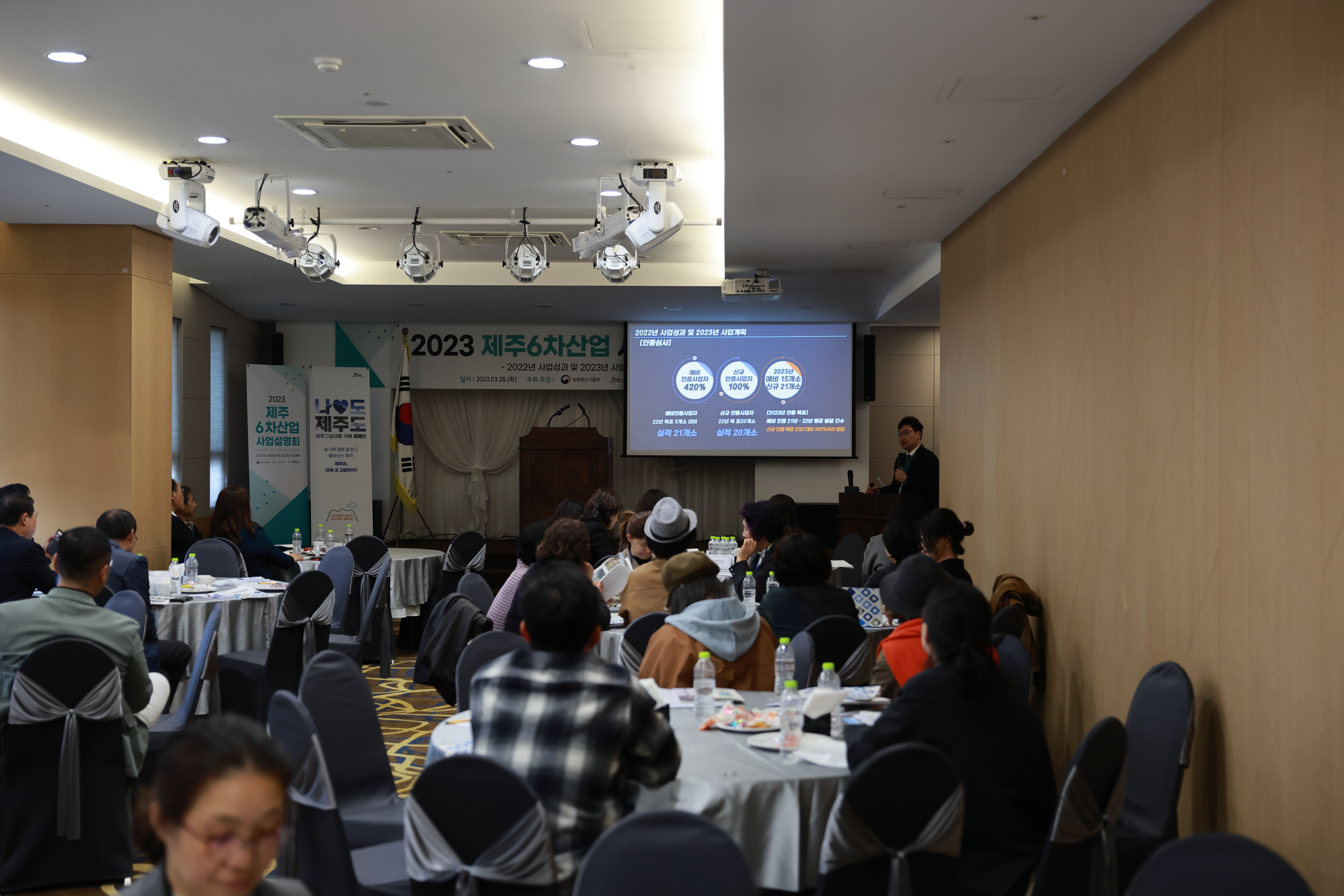 제주농업농촌진흥원 제주농촌융복합산업지원센터(이하 센터)는 제주6차산업협회와 함께 2023년 제주6차산업 사업설명회를 28일(화) 오후4시, 제주팔레스호텔에서 개최하였다. 이번 설명회는 코로나19로 인해 지난 2019년 이후 약 4년 만에 제주6차산업인들이 모여 2022년 사업성과 및 2023년 사업계획에 대한 사업설명회를 실시하였다.