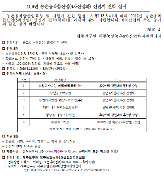 붙임1. 공고문_2019년 농촌융복합산업(6차산업화) 선진지 견학 실시.pdf (77384 bytes)